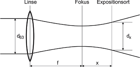Dabei ist d63 der Strahldurchmesser an der Linse, x die Entfernung des Orts der Exposition vom Fokus und f die Brennweite der Linse.
