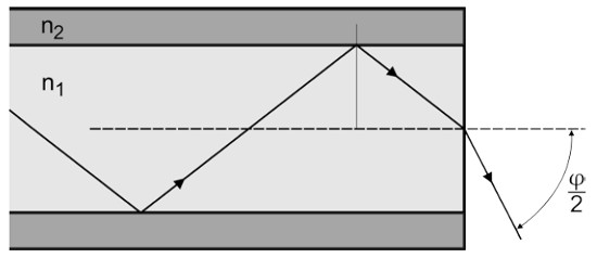 Abb. 4 Laserstrahlung aus einem Lichtwellenleiter (n1 = Brechungsindex des Kerns, n2 = Brechungsindex des Mantels)