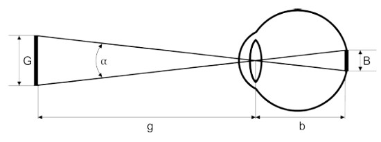 Der Expositionsgrenzwert für thermische Netzhautschädigung wird nach Tabelle A4.4 (Bereich 400 nm - 700 nm) berechnet. Er hängt von den Parametern α, CE und T2 ab. Nach Anhang 2, Abschnitt A2.3 gilt für die Winkelausdehnung α der scheinbaren Quelle:
