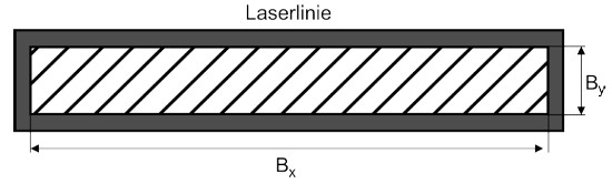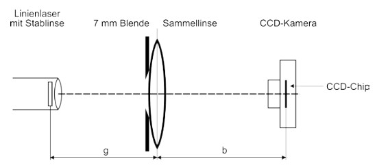 Für die Abstände von 80 mm und 400 mm muss CE ermittelt werden. Die Bestimmung von CE erfolgt über die Ermittlung der Winkelausdehnung α, unter der die scheinbare Quelle am Auge erscheint (siehe A2.3). Zur Bestimmung der scheinbaren Quellengröße wird das Auge durch eine Sammellinse und eine CCD-Kamera simuliert (siehe Abbildungen 6a und 6b). Im Prüfaufbau ist für g die Entfernung von 80 mm bzw. 400 mm zwischen der Vorderkante des Linienlasers bis zur Mitte der Sammellinse einzustellen. Die CCD-Kamera ist so zu verschieben, dass die scheinbare Quelle "scharf" abgebildet wird. Anhand des Kamerabildes werden die Größen Bx und By sowie die Bildweite b bestimmt. Wie im Laserschutz üblich, wird die verwendete Fläche auf die Größe reduziert, die 63 % der Strahlungsleistung (bzw. Strahlungsenergie) enthält. Daraus können Bx und By ermittelt werden (siehe Abbildung 7).