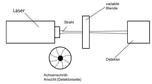 (1) In DIN EN ISO 11146 [8, 9] werden drei alternative Prüfverfahren zur Bestimmung der Strahlparameter beschrieben. Es sind die des Verfahrens der variablen Apertur (Abbildung A3.1), des Verfahrens der bewegten Messerschneide (Abbildung A3.2) sowie des Verfahrens des bewegten Schlitzes (Abbildung A3.3).