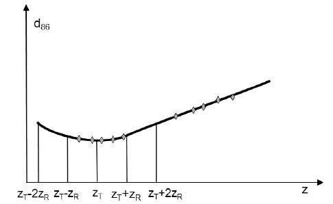 (3) Die obige Norm sieht bei frei zugänglichen Strahltaillen mindestens zehn Messungen zur Auswertung vor. Dabei sollen etwa die Hälfte in der Nähe der Strahltaille bis zu einem Abstand von plus oder minus einer Rayleigh-Länge zR erfolgen und die andere Hälfte in Abständen größer als zwei Rayleigh-Längen von der Taille (Abbildung A3.4). Ist die Strahltaille nicht zugänglich, muss das Verfahren auf eine künstlich erzeugte Taille angewendet werden.