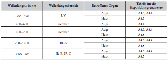 Tab. A4.1 Zuordnung der Tabellen für die Expositionsgrenzwerte zu den Wellenlängenbereichen