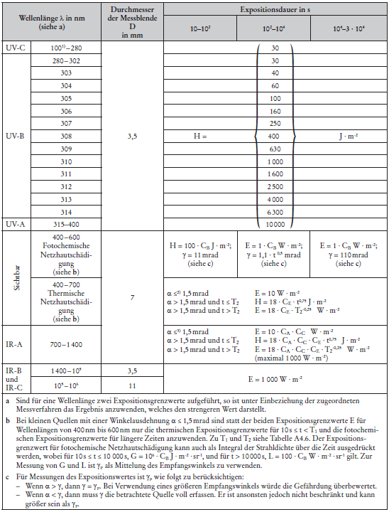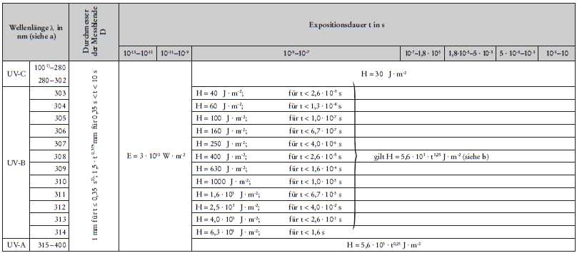 Tab. A4.8 Vereinfachte maximal zulässige Bestrahlungswerte auf der Hornhaut des Auges