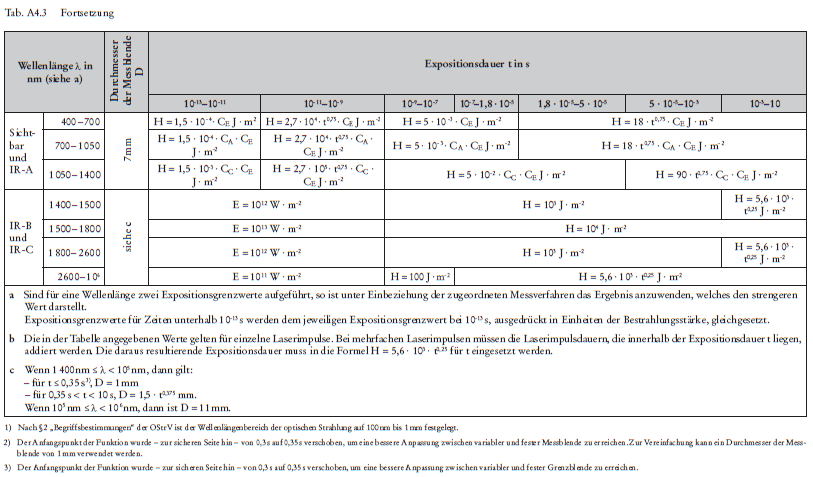 In dieser vereinfachten Tabelle wird Strahlung von Impulslasern nur bis 0,1 s als Impulslaserstrahlung betrachtet. Laserstrahlung ab 0,1 s wird als Dauerstrich-Strahlung betrachtet.