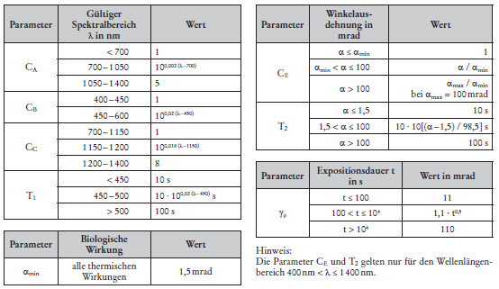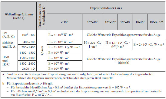 Um die Einhaltung der Expositionsgrenzwerte insbesondere für die Bestimmung der Laser-Schutz- und Laser-Justierbrillen schnell überprüfen zu können, kann folgende Tabelle, die zur sicheren Seite hin vereinfachte Grenzwerte benutzt, für viele Fälle verwendet werden.