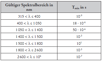 | 315 nm < λ ≤ 400 nm: | 30 000 s, oder die anzuwendende Expositionsdauer, falls diese kürzer ist; |