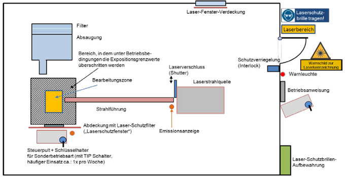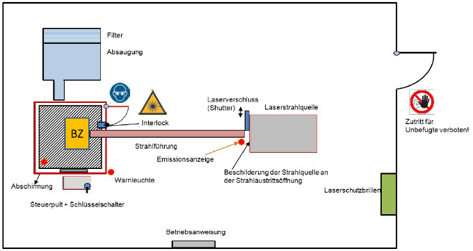 Abb. A3.1 Kennzeichnung und Abgrenzung des gesamten Raumes als Laserbereich für industrielle Anwendungen. Bei anderen Anwendungen kann die Schutzverriegelung an der Eingangstür durch andere Maßnahmen zur Abgrenzung (z. B. schleusenartiger Eingang) ersetzt werden.